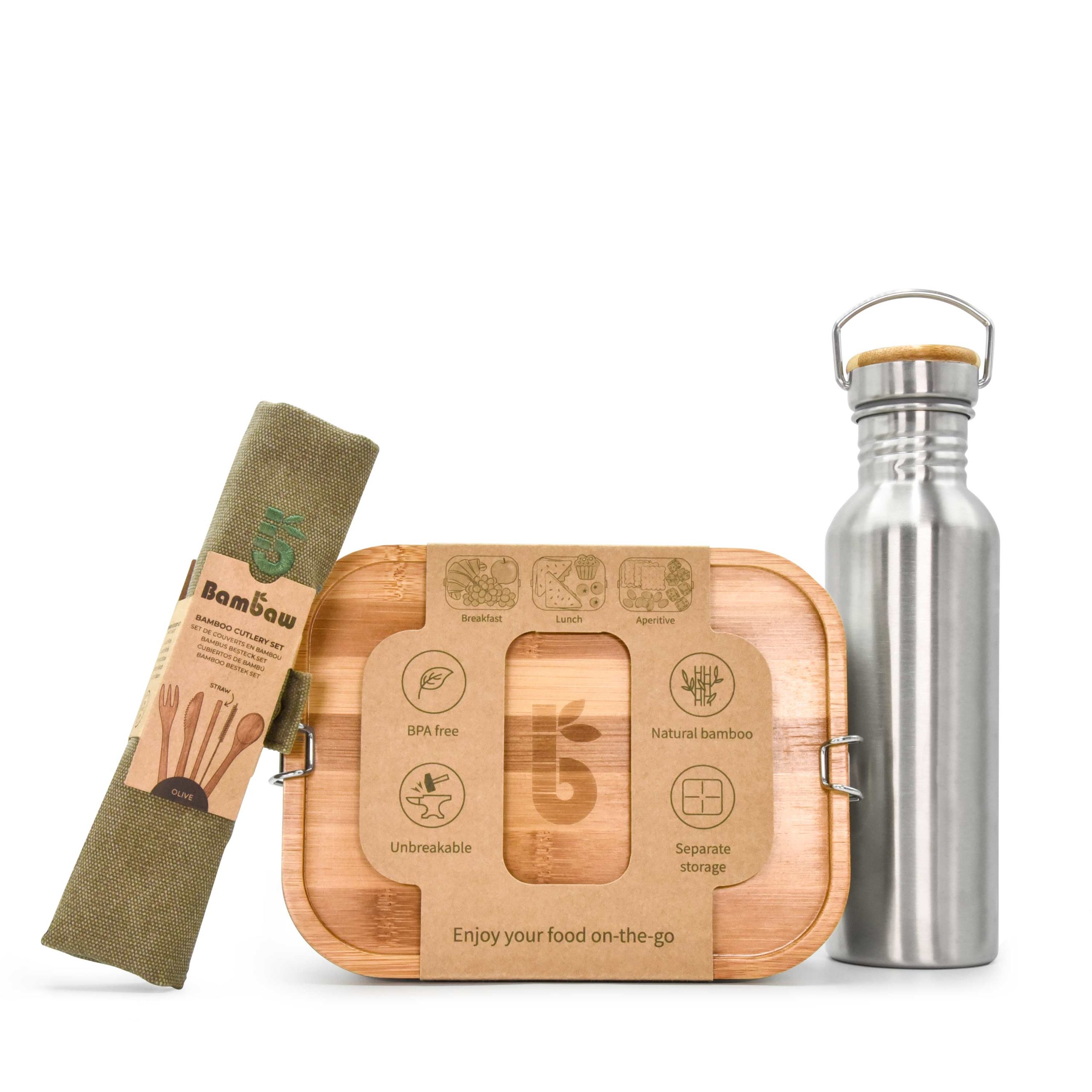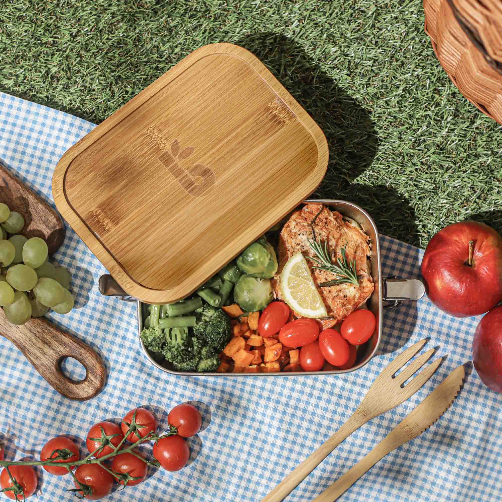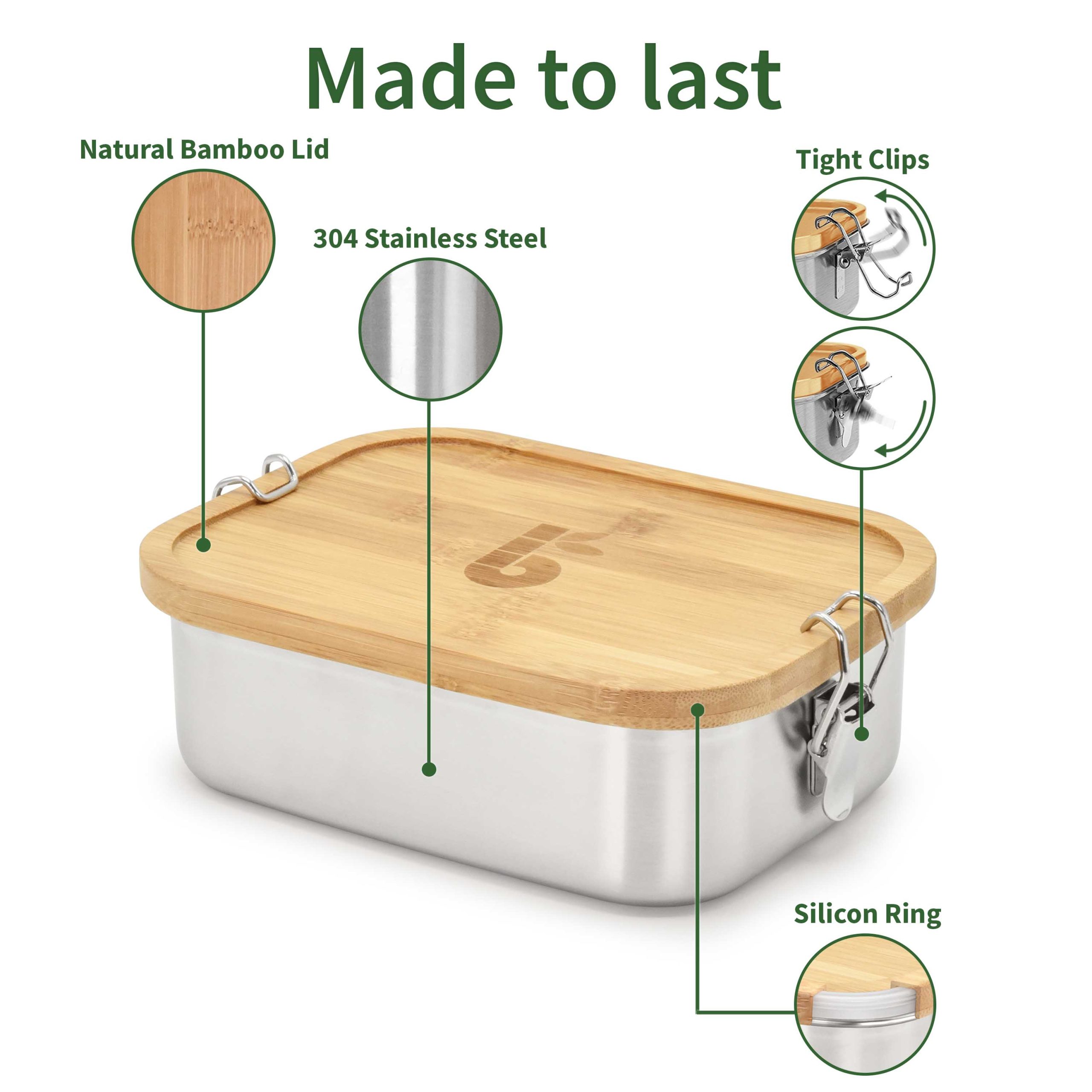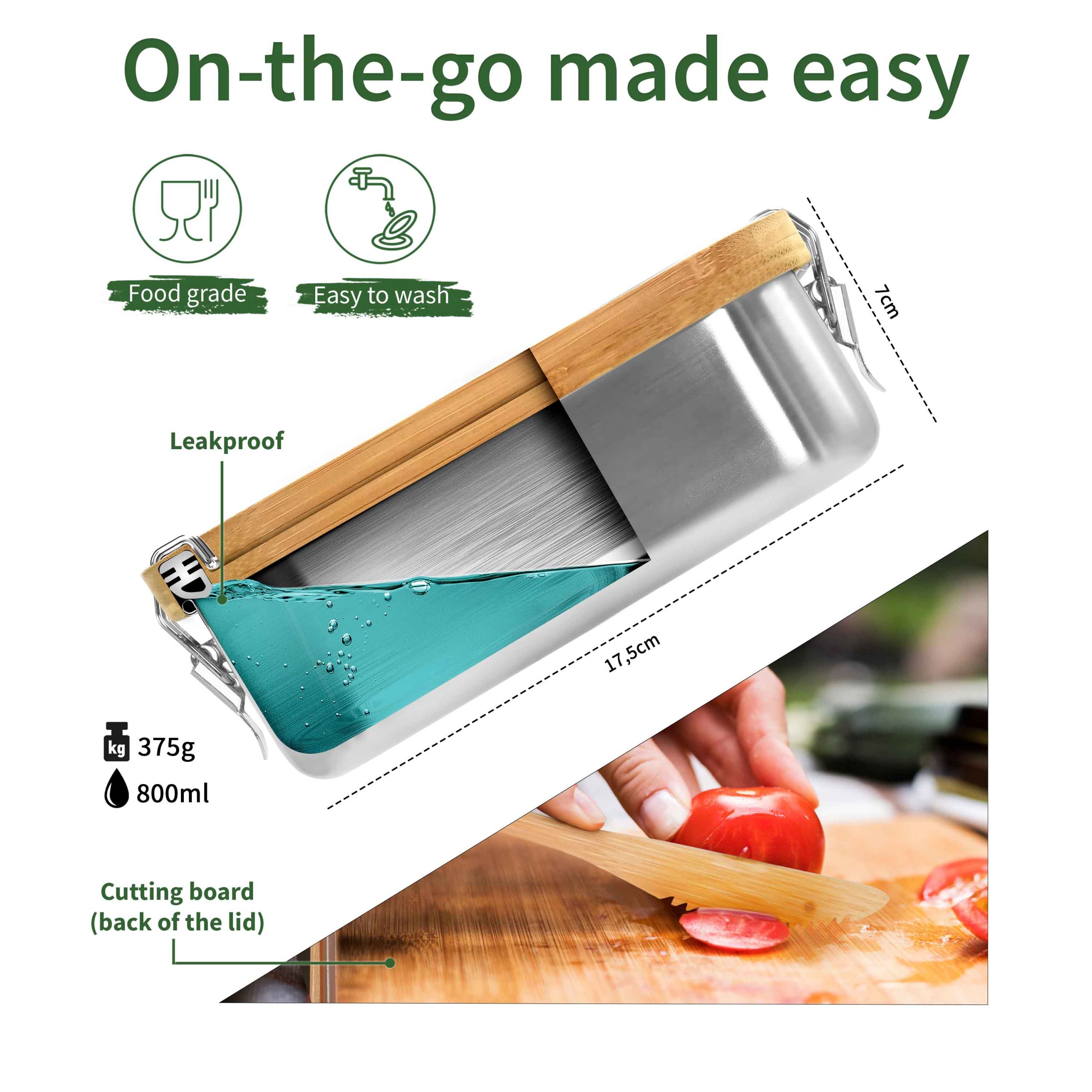 Carmanyola d’acer inoxidable amb tapa de bambú ideal per als teus menjars i snacks fora de casa gràcies als seus separadors ajustables i la seva tapa resistent a prova de vessaments.
