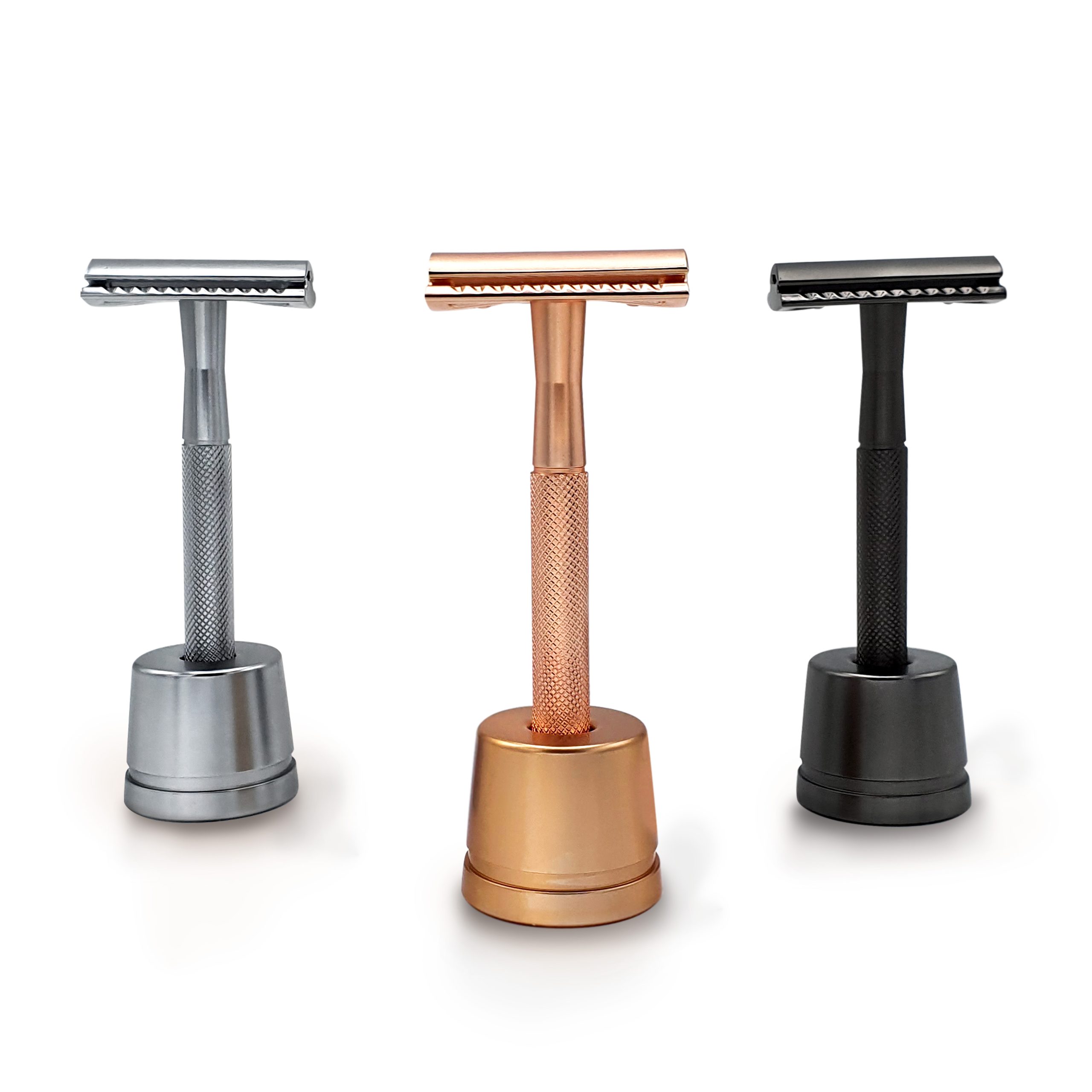 Aquesta maquineta d’afaitar de doble tall inclou un suport de metall perquè puguis guardar-la i col·locar-la en el teu bany després de cada ús. És tan chula que gairebé sembla un objecte de decoració vintage.