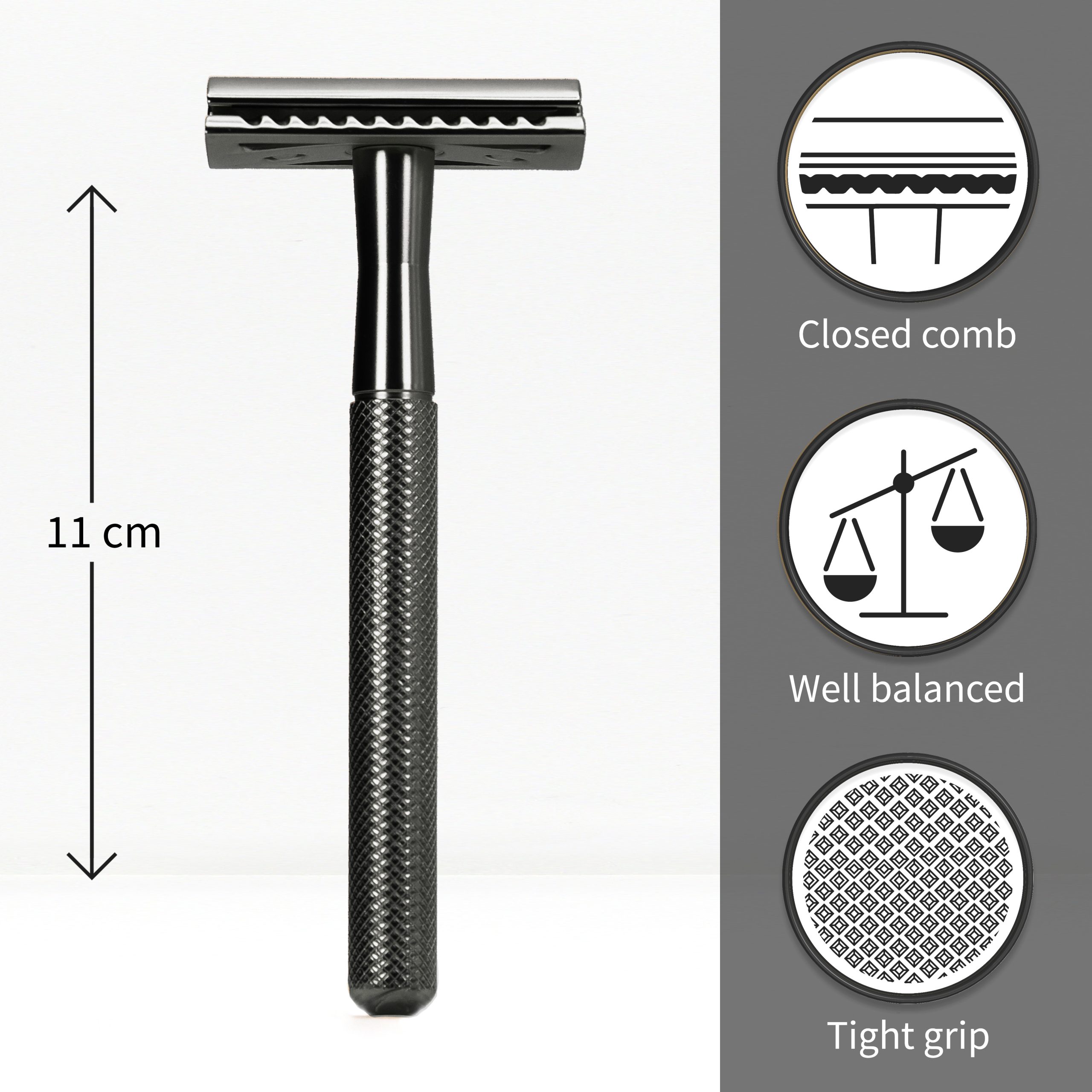Els materials d’aquesta maquineta metàl·lica de doble tall són de qualitat superior, un factor que t’ajudarà a aconseguir un millor afaitat. En primer lloc, les fulles són d’acer inoxidable, un material que et permetrà gaudir d’un acabat apurat i es manté esmolat durant molt de temps. Aquestes fulles no s’oxiden, per la qual cosa són més resistents que les maquinetes amb múltiples fulles i capçals de plàstic reemplaçables.El mànec i el capçal de la maquineta, estan fabricats en llautó. Aquest material és pesat i t’ajudarà a apurar al màxim el resultat. Finalment, la textura del seu llarg mànec garanteix una subjecció perfecta. Així que no hi ha risc que se’t rellisqui de la mà, ni tan sols a la dutxa.